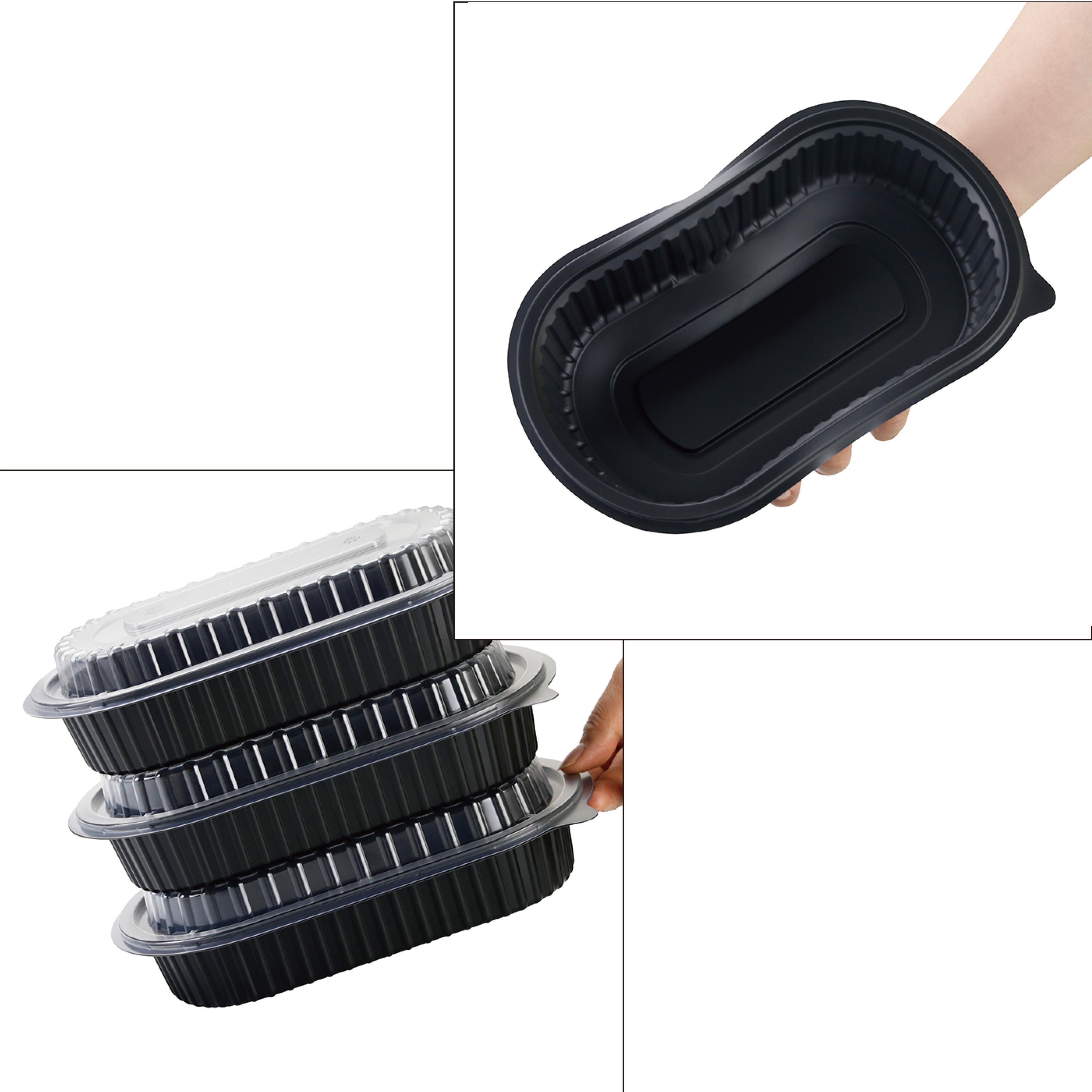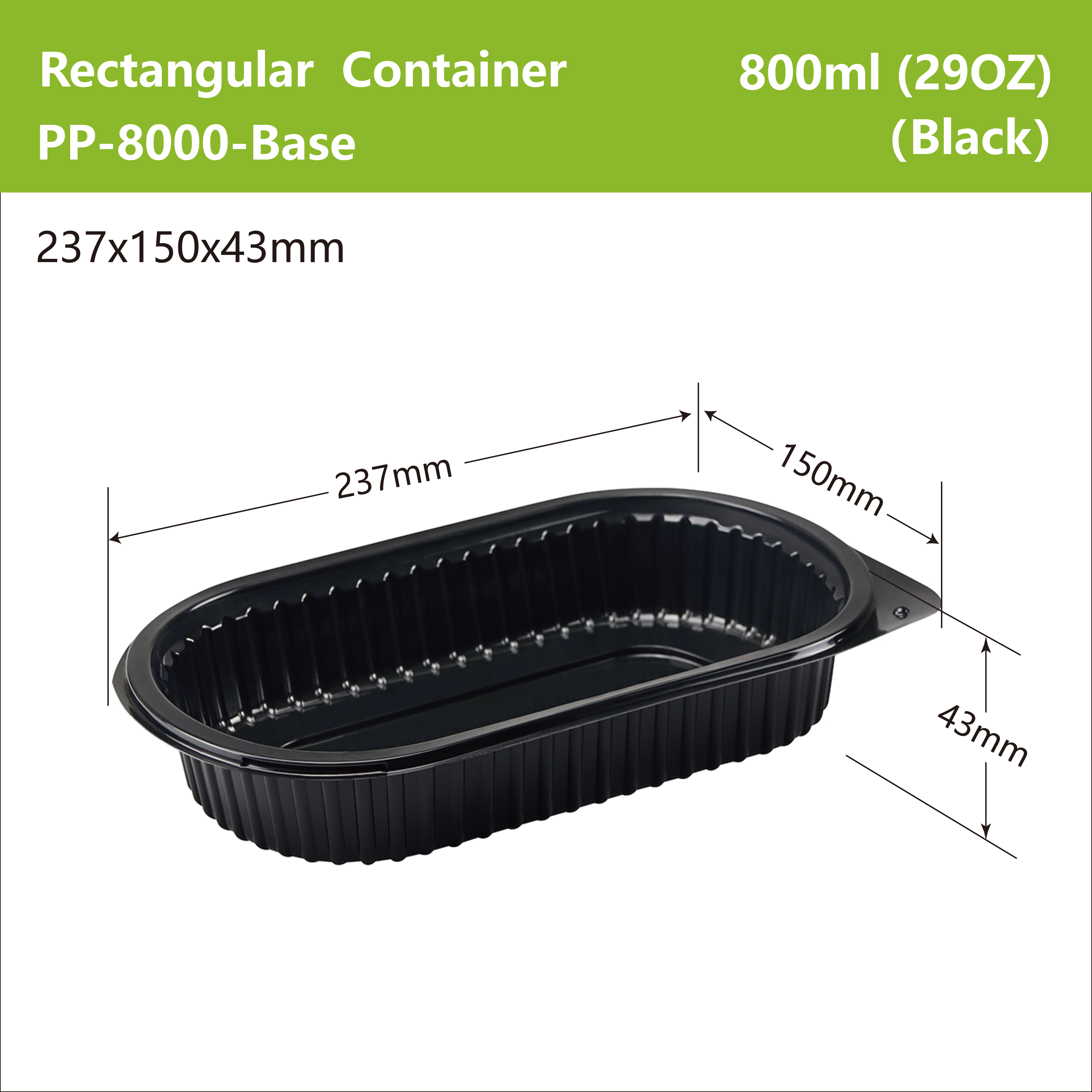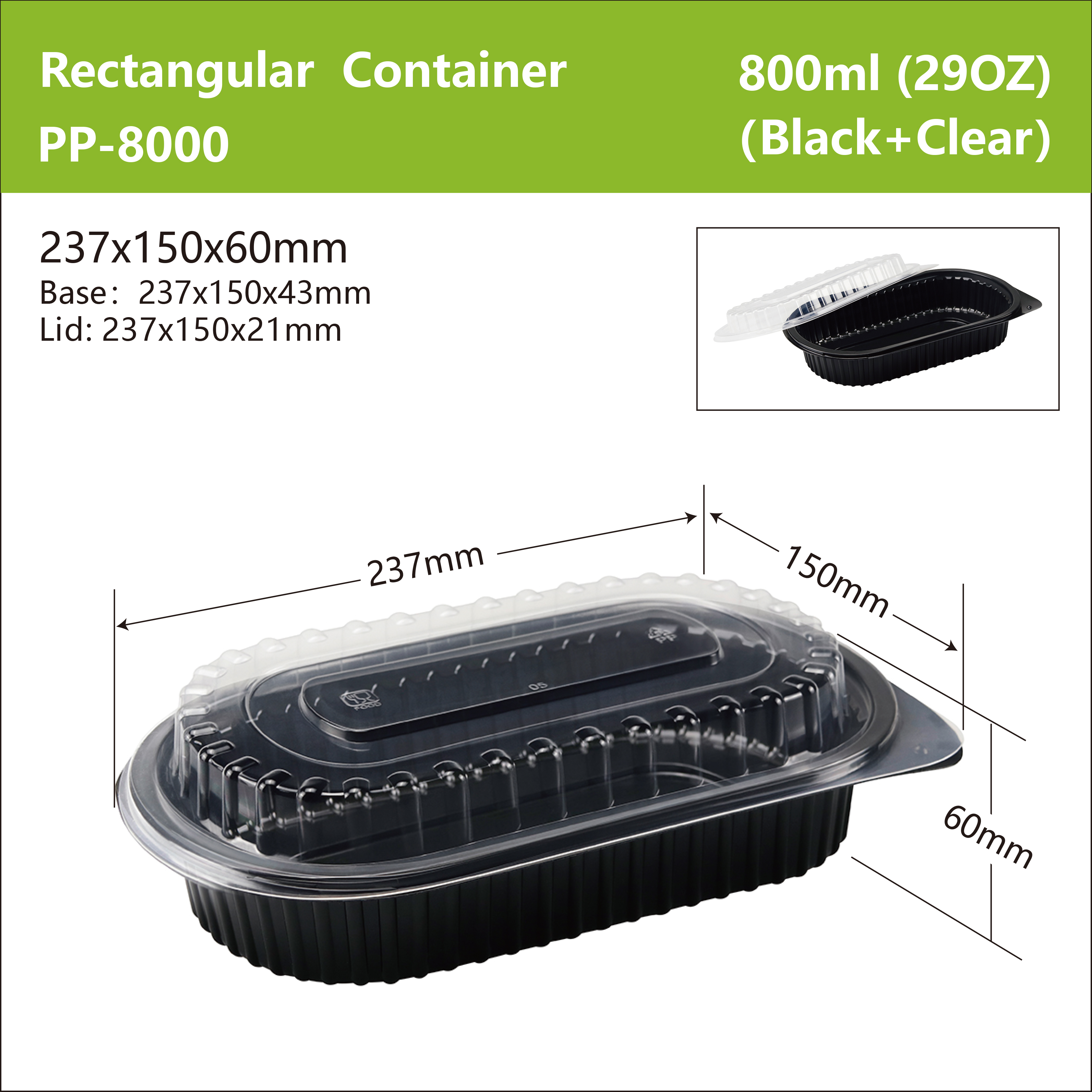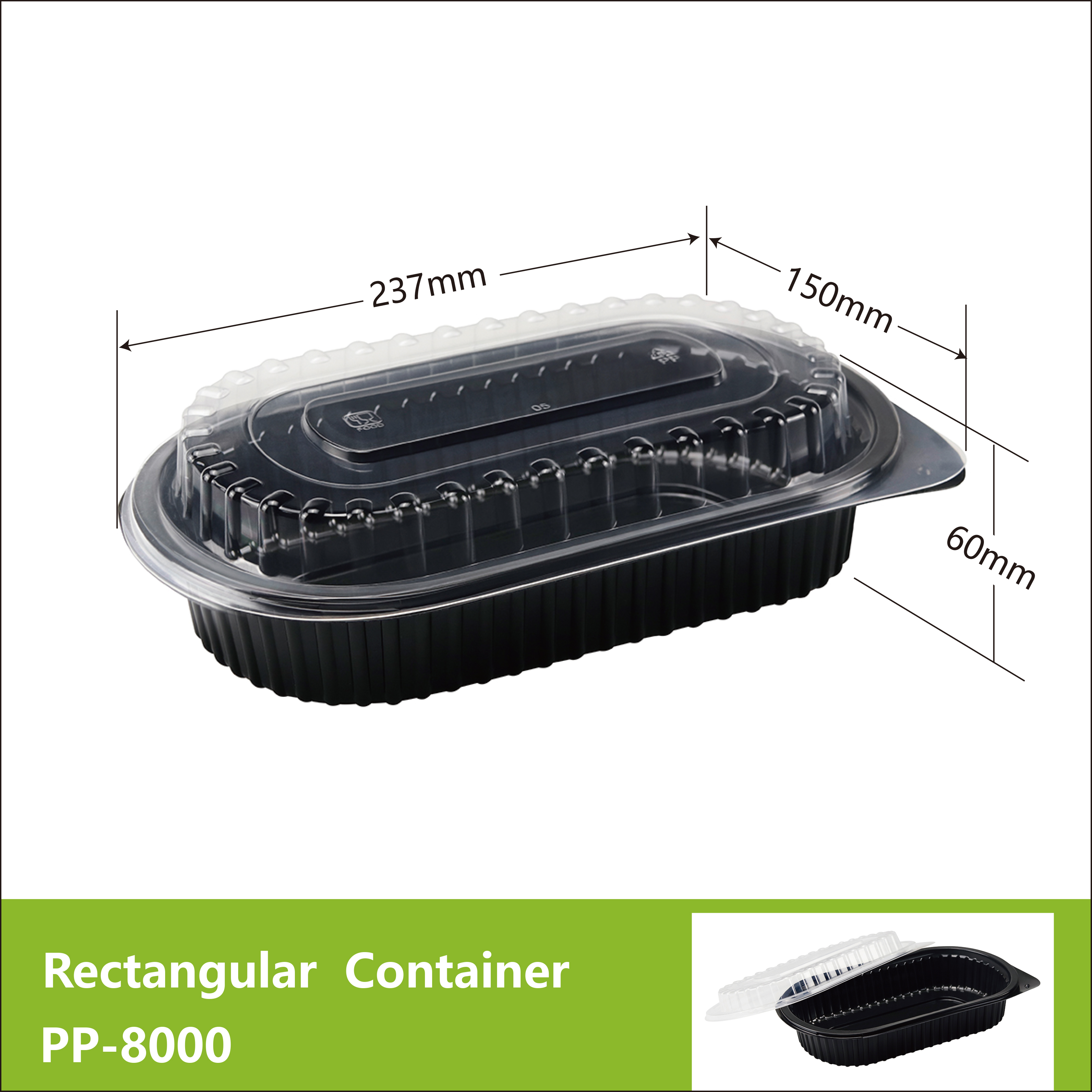 PP-8000 Rectangular Container Usage:Food Packing Product name:Heat-sealable film PP plate Color:White/Black Size:237x150x60mm Shape:Rectangular Feature:Microwavable Type:Eco-friendly Material Place of Origin:CN Material:Mineral filled PP